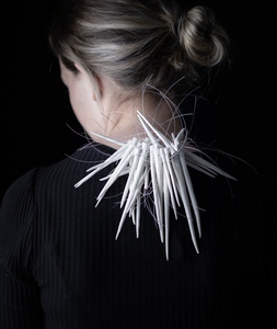 2018Ketting met porseleinen schijfjes, samengebonden met aluminium draad. Dubbel om de nek 34 cm x 19 cm.
